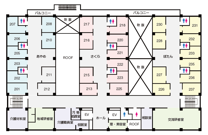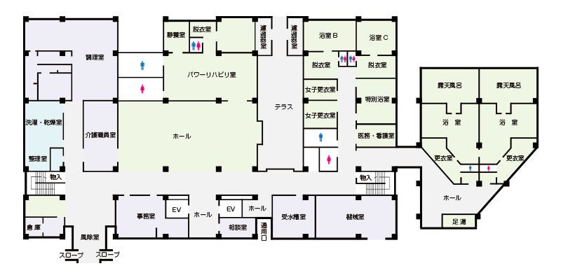 | 入居者の安全を確認しやすいように配慮されています。完全なバリアフリーで、間取りは広く、車椅子の出入りも余裕に行えます。 |