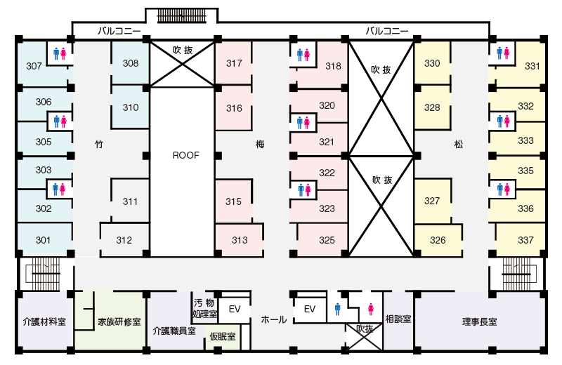 | 2階と3階に設置されています。介護職員が入居者のサポートを速やかに行うために24時間で体制待機しています。 |