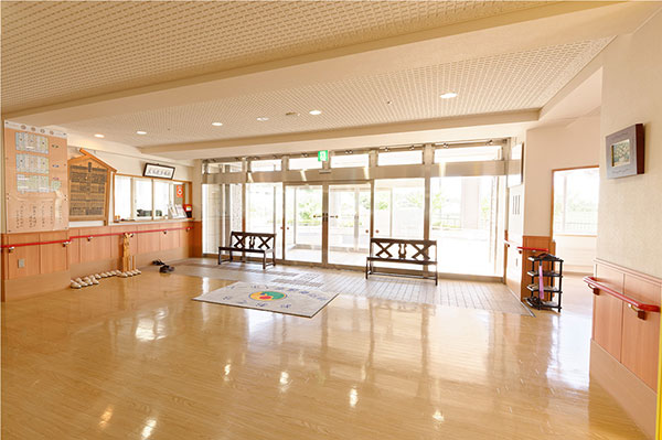 | 玄関は広く明るく開放的に設計されています。デイサービスの忙しい時間帯でも余裕をもって対応できます。 |