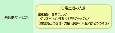 | 通所介護は、利用者が可能な限り 自宅で自立した日常生活を送ることができるよう、 自宅にこもりきりの利用者の孤立感の解消や心身機能の維持、 家族の介護の負担軽減などを目的として実施します。 利用者が通所介護の施設(デイサービスセンターなど)に通い、 食事や入浴などの日常生活上の支援や、 生活機能向上のための機能訓練や口腔機能向上サービスなどを 日帰りで提供します。 生活機能向上グループ活動などの高齢者同士の交流もあり、 施設は利用者の自宅から施設までの送迎も行います。 |