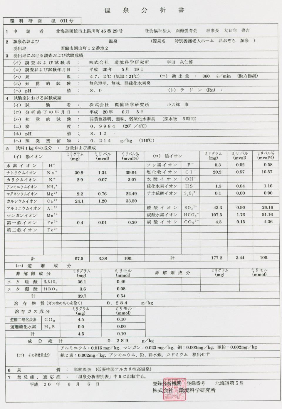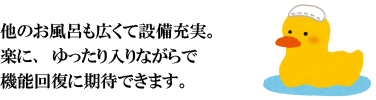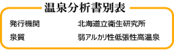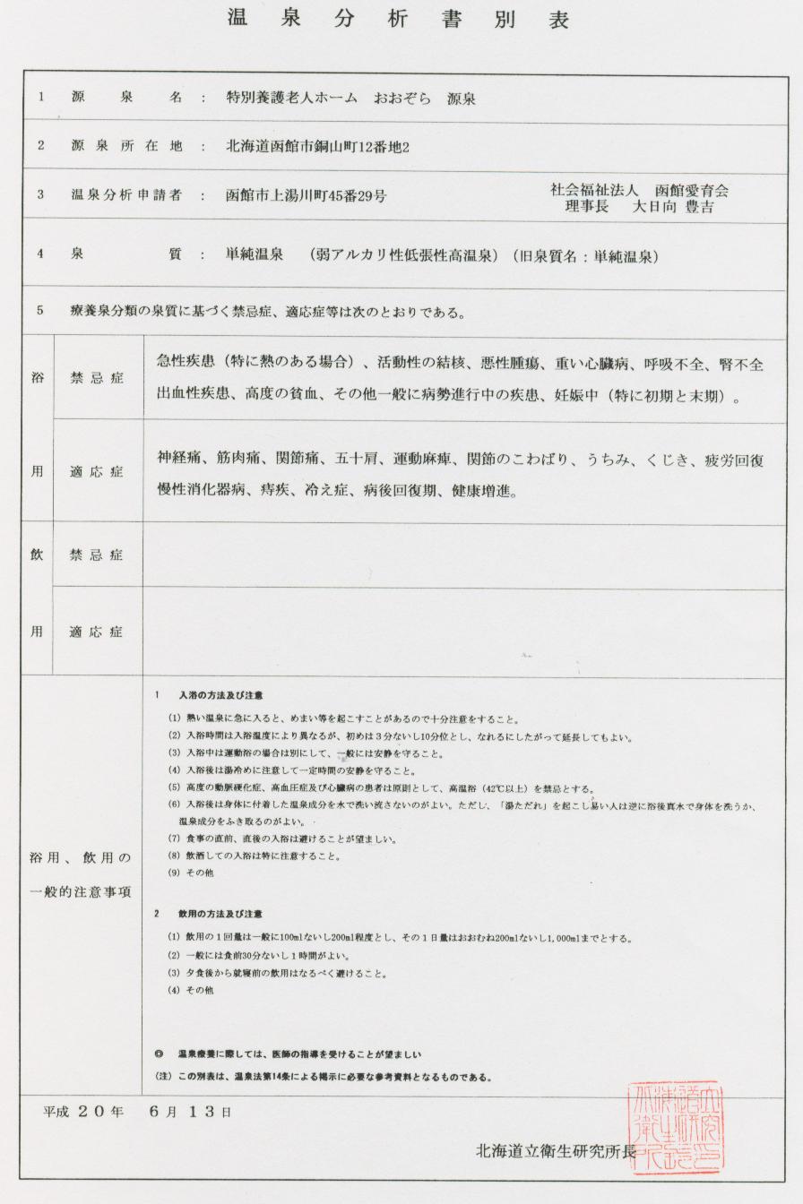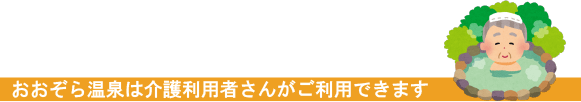 | おおぞらの天然温泉は還元作用があるとされ、 その泉質は弱アルカリ性の単純温泉で、神経痛筋肉痛、関節痛、五十肩、運動麻痺、筋肉のこわばり、打ち身、くじき、疲労回復、慢性消化器病、痔疾、冷え性、病後回復期、健康増進などの効果があるとされています。 |